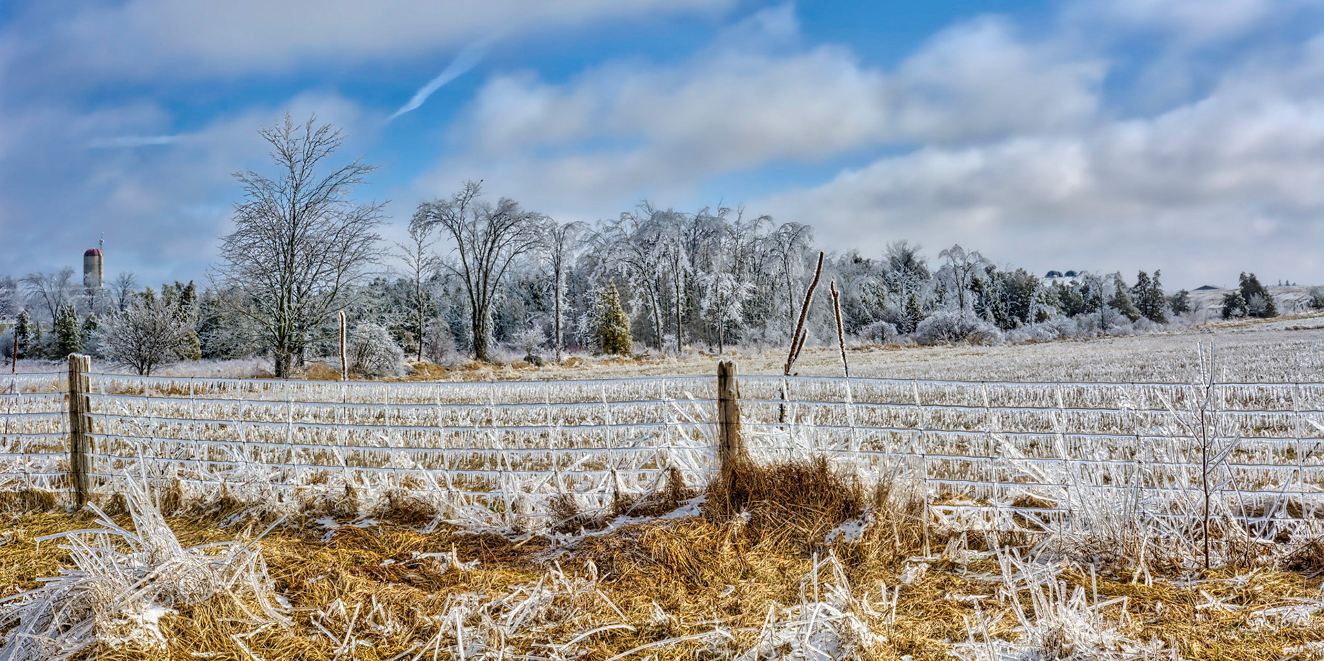 Clear blue skies over farm after an ice storm